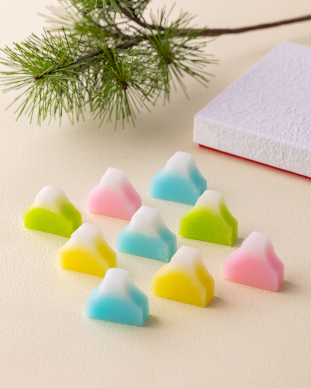 富士山をかたどった寒氷。一列に並べてみると、小さな富士が連なる姿は、どこか愛らしく思わず眺めたくなる景色です。
