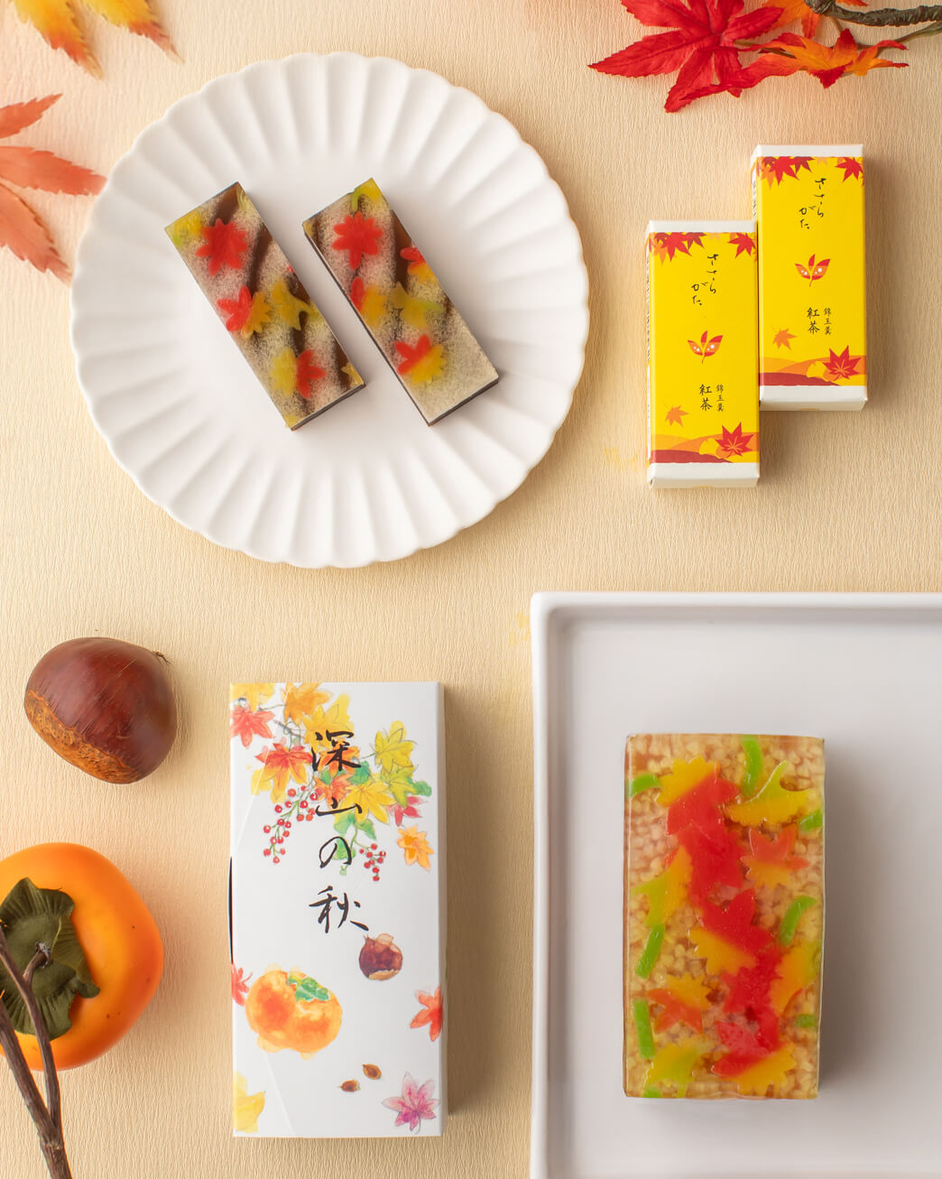 秋の彩りを閉じ込めた、紅葉模様の「深山の秋」と「ささらがた 紅茶」。