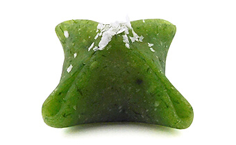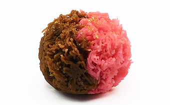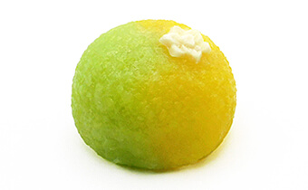 道明寺で黄色と緑色に染めた白小豆こしあんを包み、煉薯蕷の花をのせて表わしました。