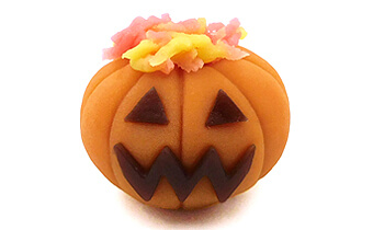 こなしでハロウィンのかぼちゃをかたどり、中は小豆こしあんとしました。目と口は羊羹で出来ています。
