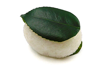 平安時代、中国から伝来した菓子を唐菓子(からくだもの)と云い、その中に椿餅(つばいもち)の名があります。その姿を道明寺に小豆粒あんを包み、椿の葉で挟んで表わしました。