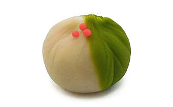 小豆こしあんを二色の煉切で包み、斑入りの葉を表現しました。