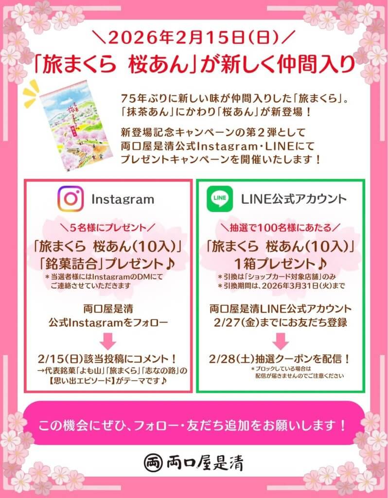 この度、 2026年2月15日(日)より新登場「旅まくら 桜あん」の発売を記念して、プレゼントキャンペーンを下記のとおり開催いたします。
