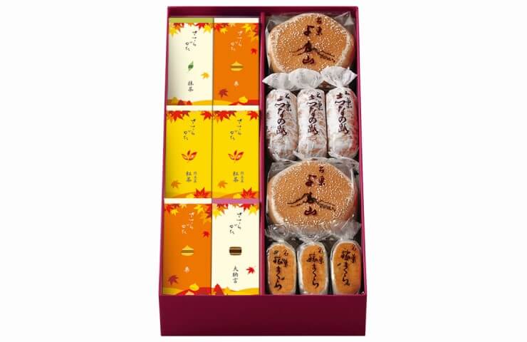 秋限定のささらがた「紅茶」「栗」と一年を通して人気の高い「大納言」「抹茶」のささらがた4種類を、両口屋是清一番人気の代表銘菓「よも山」「旅まくら」「志なの路」と詰め合わせました。