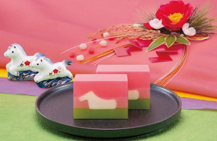 【干支羊羹】いにしえから神様の乗り物として神聖視された白馬。早春の草原を優雅に歩む白馬の姿を、じっくり炊き上げた煉羊羹で意匠しました。❝限りなき春の風なり馬の上” 夏目漱石