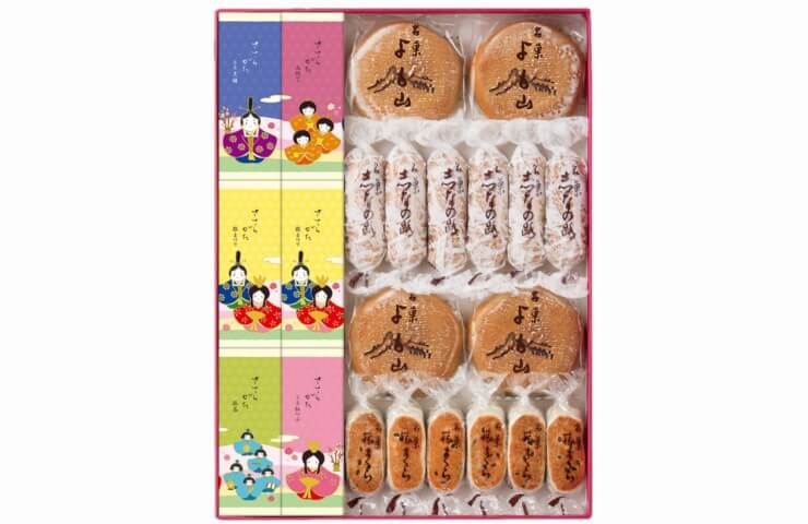 季節限定の「雛まつりささらがた」と両口屋是清一番人気の「焼菓子(よも山・旅まくら・志なの路)」を詰合せいたしました。