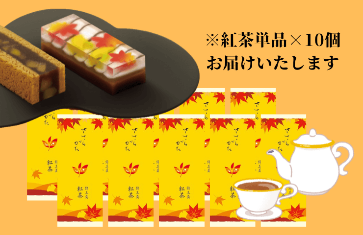 鮮やかな紅葉や銀杏が見た目にも美しい秋限定の錦玉羹「紅茶」。香り高い紅茶の風味がふわりと広がり、深まる季節を感じさせます。紅葉が川面を流れる情景は職人の手作業によってひとつひとつ丁寧に仕上げられるため、一本ごとに異なる“秋の景色”をお楽しみいただけます。パッケージから羊羹の姿まで、目でも舌でも秋を堪能できる一品です。
