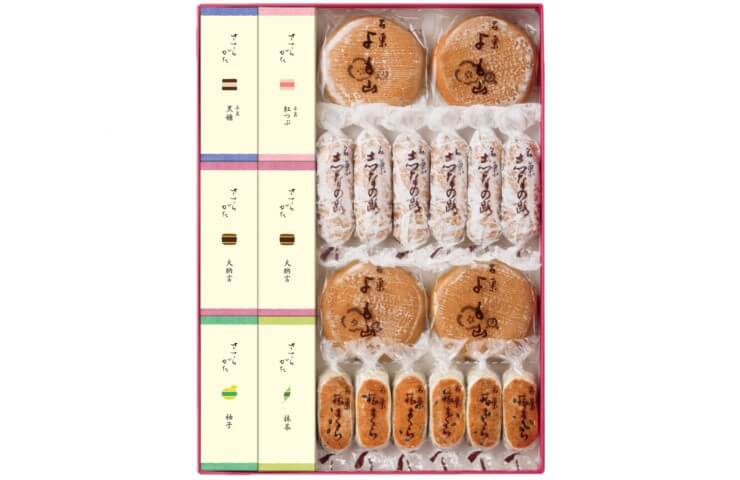 ささらがた「大納言、柚子、抹茶、黒糖、紅つぶ」5種類と両口屋是清の定番「3種の焼菓子」の詰め合せです。